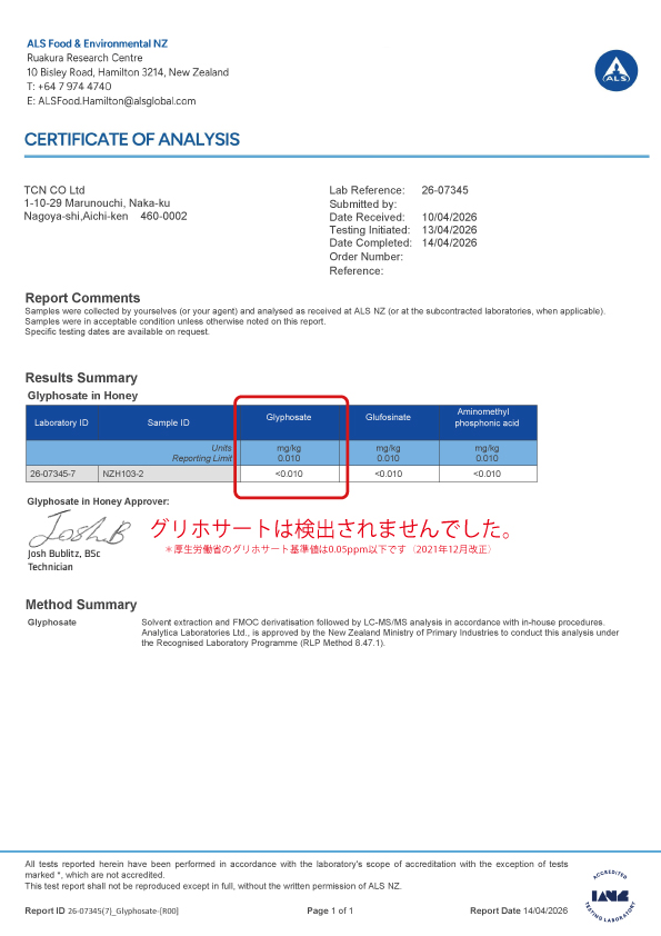 日本では厚生労働省の認可機関「ユーロフィンQKEN株式会社」にて検査、ニュージーランドでは現地政府が認可する検査機関「ALS Food and Environmental NZ.」にて実施しています。