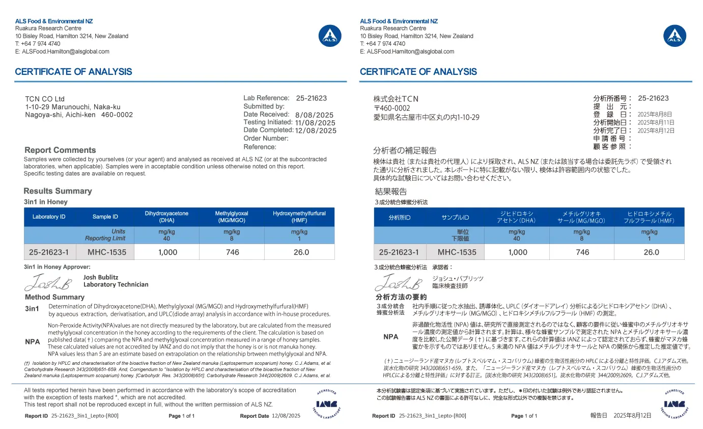 TCNでは、平成10年よりマヌカハニー製品に分析書を同梱した元祖企業です。平成22年4月よりMGOの表記を始めており、お買い上げ品にはニュージーランド第一次産品省公認の「ALS Food and Environmental NZ.」にて計測した「MGO分析書」複本とその日本語翻訳書が同梱されます。