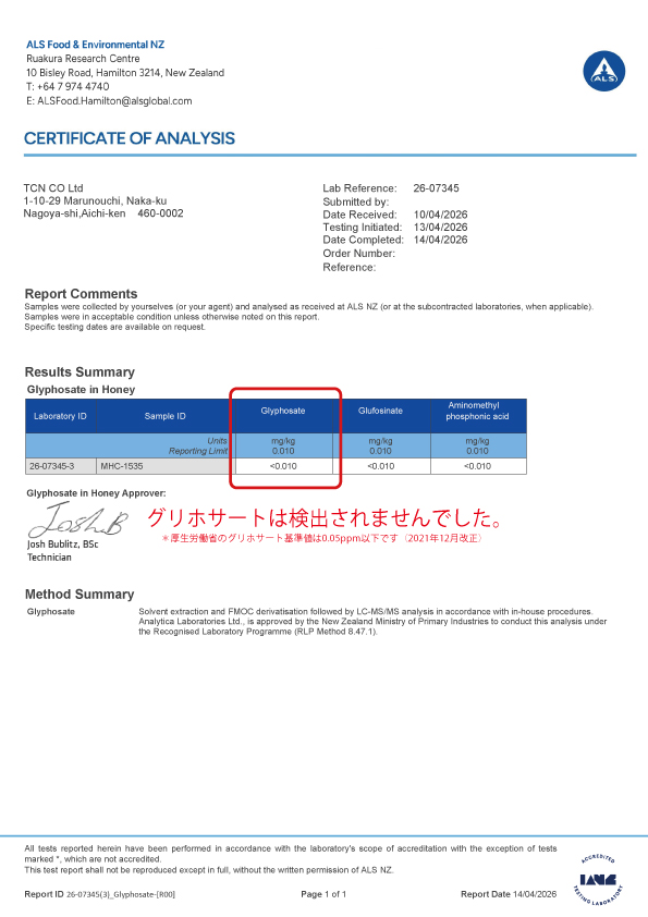 TCNでは、平成10年よりマヌカハニー製品に分析書を同梱した元祖企業です。平成22年4月よりMGOの表記を始めており、お買い上げ品にはニュージーランド第一次産品省公認の「ALS Food and Environmental NZ.」にて計測した「MGO分析書」複本とその日本語翻訳書が同梱されます。