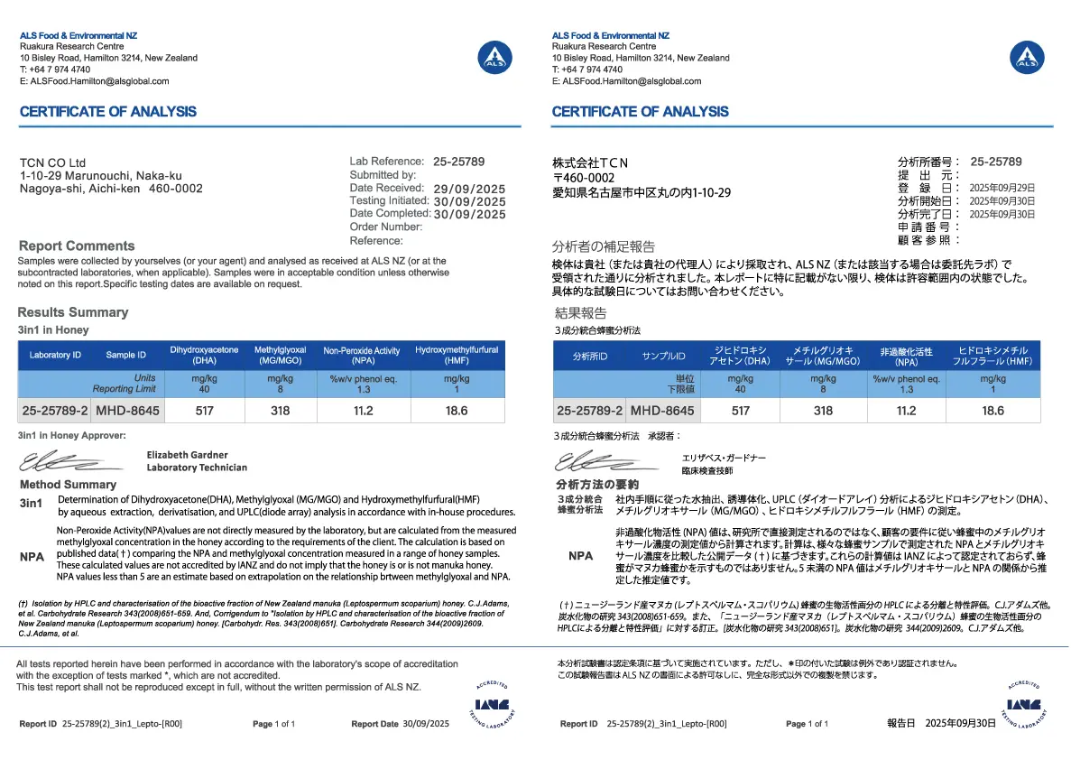 TCNでは、平成10年よりマヌカハニー製品に分析書を同梱した元祖企業です。平成22年4月よりMGOの表記を始めており、お買い上げ品にはニュージーランド第一次産品省公認の「ALS Food and Environmental NZ.」にて計測した「MGO分析書」複本とその日本語翻訳書が同梱されます。