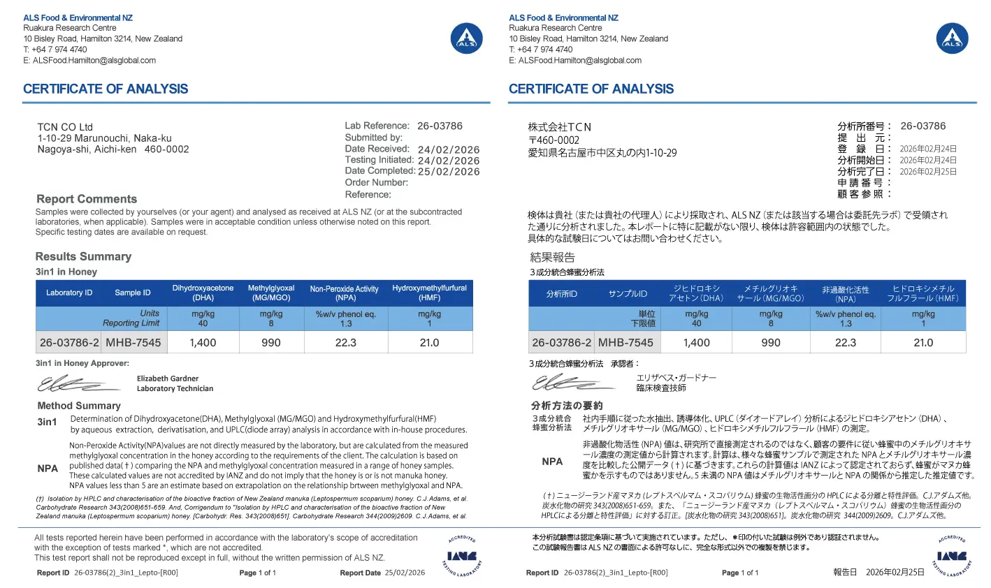 TCNでは、平成10年よりマヌカハニー製品に分析書を同梱した元祖企業です。平成22年4月よりMGOの表記を始めており、お買い上げ品にはニュージーランド第一次産品省公認の「ALS Food and Environmental NZ.」にて計測した「MGO分析書」複本とその日本語翻訳書が同梱されます。